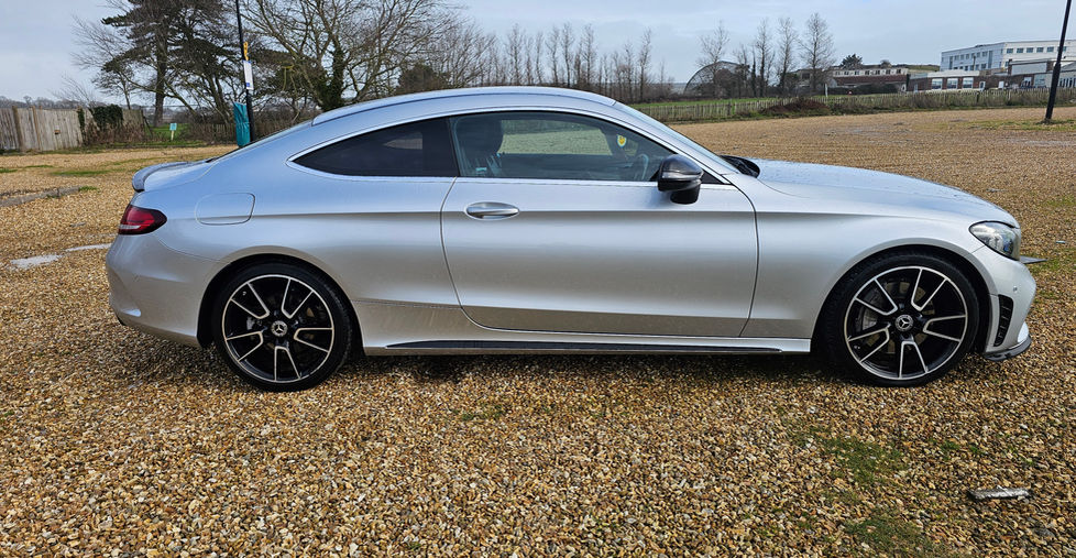 2019-68 Mercedes C300 AMG Line G-Tronic+ 2dr. Stunning Coupé in Iridium silver metallic with black half leather sports trim, 18" alloys, electric windows and mirrors, air conditioning and dual zone climate control, High resolution 10.25" multimedia colour display with bluetooth, DAB, smart phone integration, auxiliary and USB, isofix child seat anchor points, active parking assist including Parktronic and rear camera, 9 speed G-Tronic system with dynamic mode select for Comfort-ECO-Sport-Sport plus and individual, speedtronic cruise control, adaptive brake assist with hold and brake drying function.....the list goes on... And incredible car with just 69000 miles and a full service history....